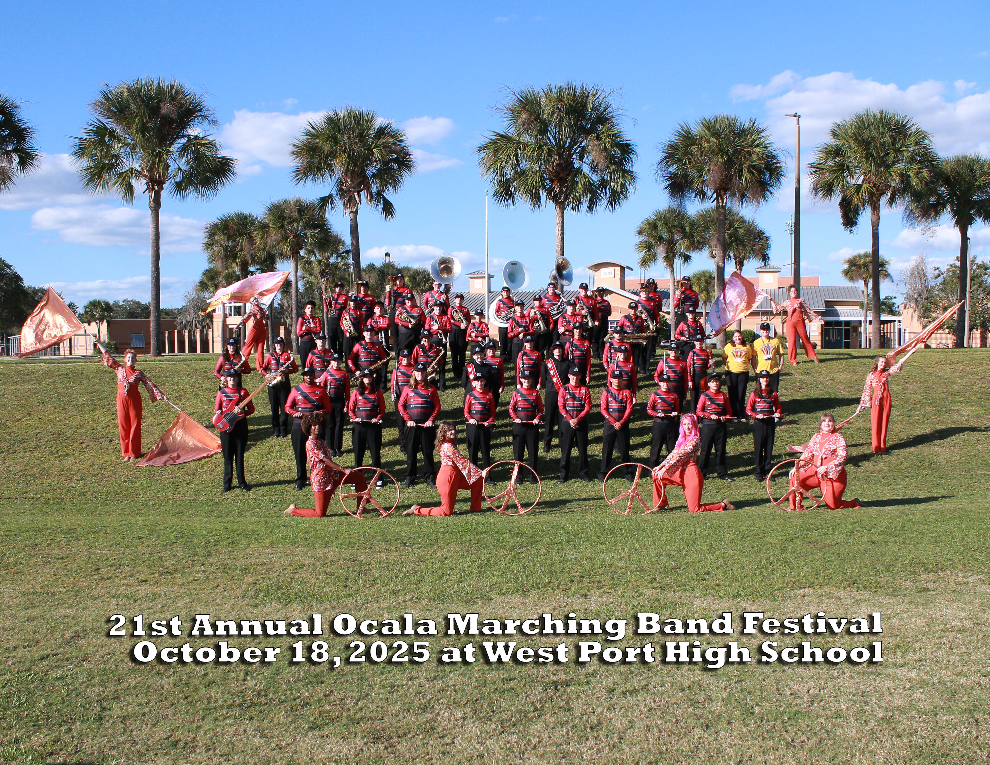 Group photo of The Fort White Marching band during The 21st Annual Ocala Marching Band Festival. Taken on October 18, 2025 at West port High School.