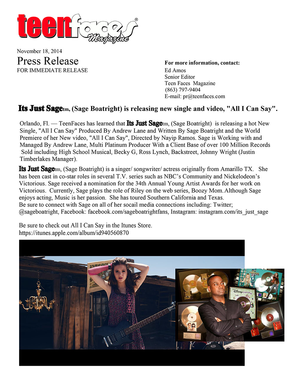 0 thoughts on “Press Release Its Just Sage, (Sage Boatright), Is Releasing New Single All I Can Say”